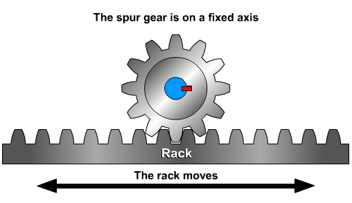 A rack has teeth set in a straight line. When the pinion gear is rotated on a fixed axis the rack is forced to move.